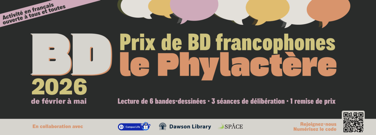 Students will debate, discuss, and vote for the Dawson Golden Phylactère Award. Participation counts toward the SPACE Certificate and there will be prizes students can win.